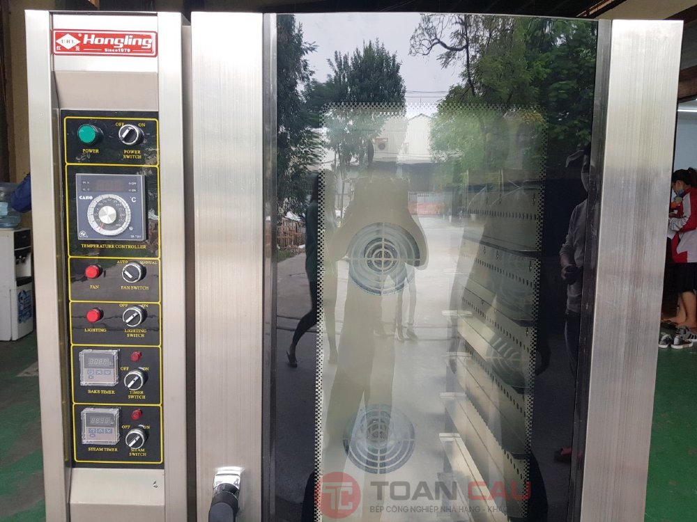 Lò nướng đối lưu Hongling 10 khay RX-10D sở hữu 2 quạt gió đối lưu lớn, kết hợp cơ chế phun ẩm giúp bánh chín đều và không bị nứt.