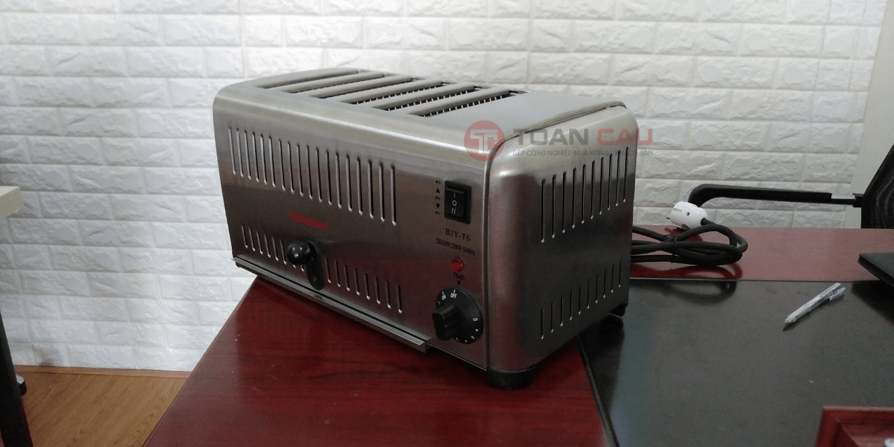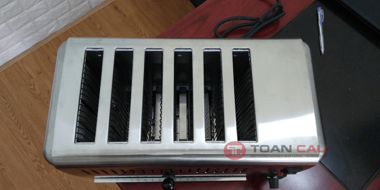 Máy nướng bánh mì 6 khe có kích thước nhỏ gọn nhưng công suất đạt tới 2500w, có núm điều chỉnh thời gian hẹn giờ tiện dụng. Máy thiêt kế cần gạt nâng bánh lên sau quá trình nướng xong giúp chúng ta chánh tiếp xúc trực tiếp vào khe nướng.