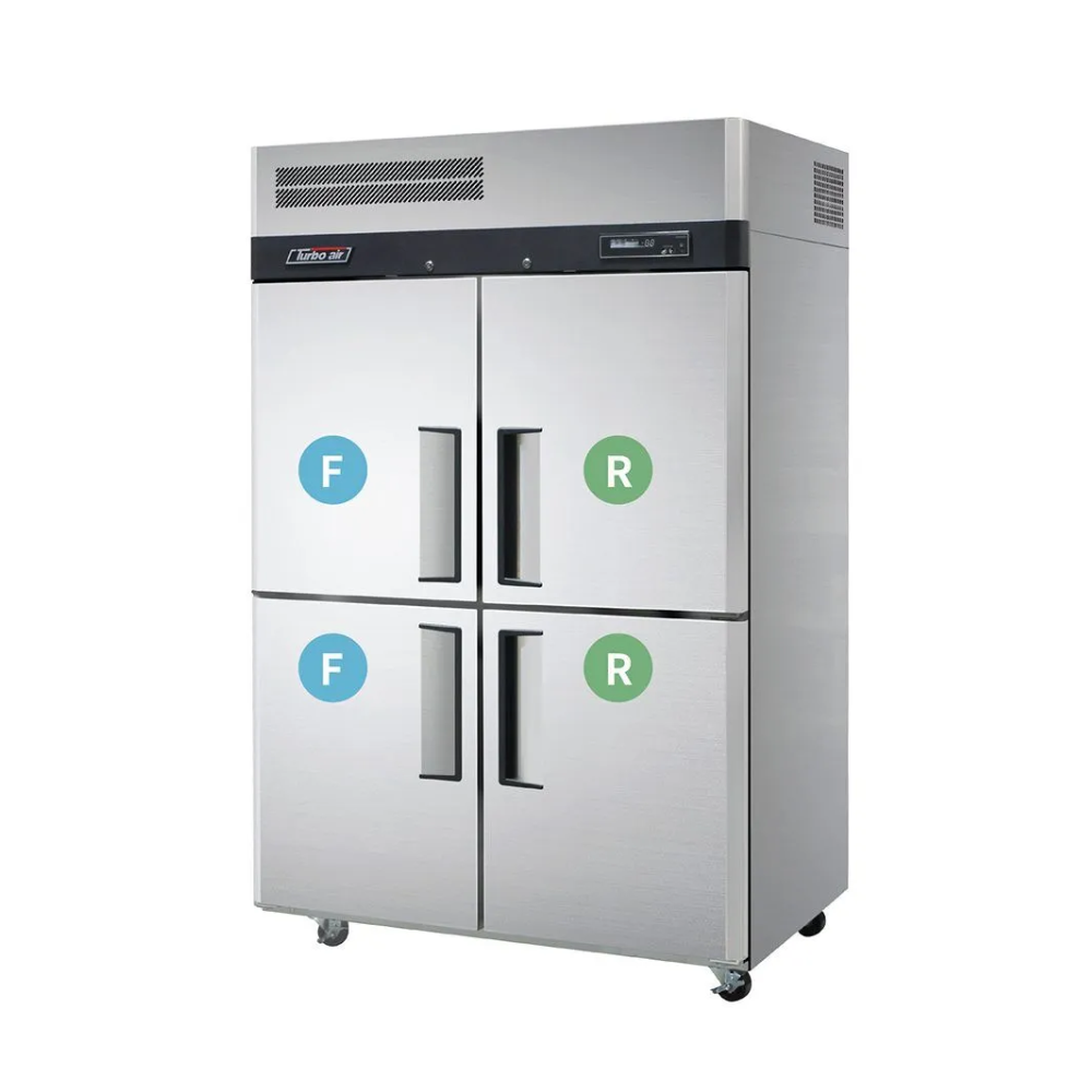- Tủ 1/2 Mát 1/2 Đông Turbo Air KRF45-4H có thiết kế dạng đứng 4 cửa với 1 bên có chức năng giữ mát, bên còn lại có chức năng làm đông. Bề mặt làm bằng inox mang đến cảm giác chắc chắn và sang trọng.