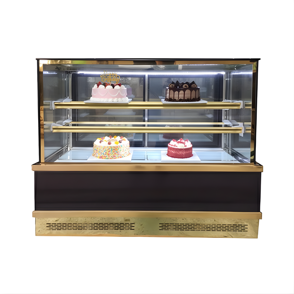 Tủ trưng bày bánh kem có thiết kế kính vuông và dung tích lớn có thể trưng bày bánh, đồ uống, trái cây … với số lượng nhiều.