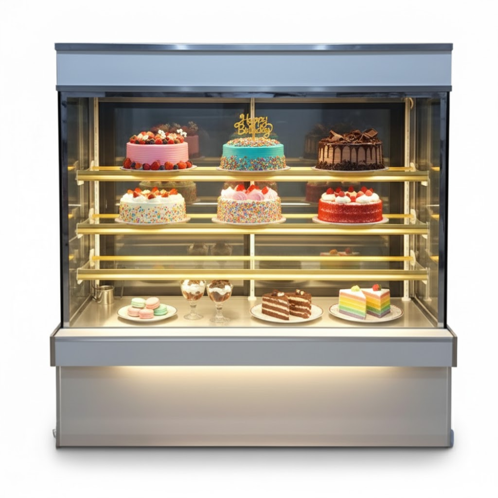 Nhiệt độ trong tủ trưng bày bánh kem kính vuông được giữ ở mức 2°C – 10°C, bảo quản bánh rất tốt, không bị chảy kem. Giữ hình dạng cho bánh và nguyên liệu không bị biến mùi. Đặc biệt trong mùa hè nóng thì tủ trưng bày như vậy đặc biệt cần thiết.